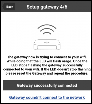 When the LED stops flashing, your gateway has been connected to the WLAN. Now tap on „Gateway successfully connected“.