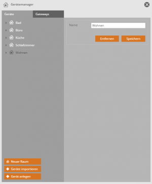 Der Bereich „Geräte“ innerhalb des Geräte-Managers dient zur Verwaltung der zu steuernden Endgeräte (wie z.B. TVs, Hifi-Anlagen, Funk-Komponenten…). Hier wird jedem Endgerät zugewiesen, wie und durch welches Gateway (z.B. AIO GATEWAY) es angesprochen und gesteuert werden kann.