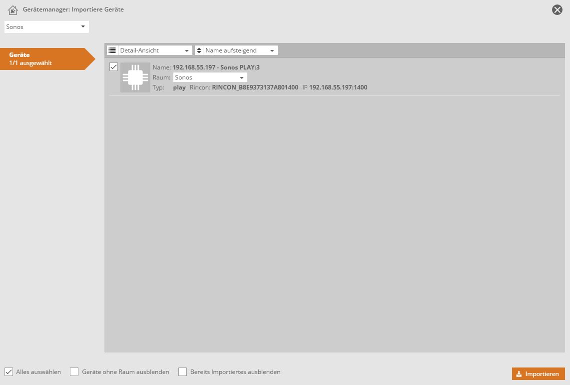 Bei einer Sonos-Soundanlage können die dort gespeicherten Geräte/ Komponenten automatisch per Import in den Geräte-Manager integriert werden. Voraussetzung ist ein entsprechendes NEO Plugin.