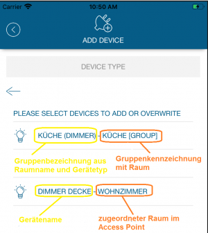 In den Geräte-Gruppen pro Raum können mehrere Einzel-Komponenten innerhalb eines Raumes als Gerät-Gruppe zusammengefasst importiert werden und dann als gesamte Gruppe gesteuert werden.