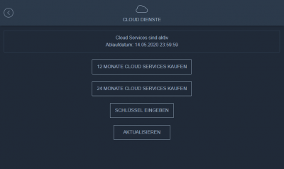 Unter Cloud-Dienste können Sie Cloud-Services erwerben, das Ablaufdatum derselben einsehen oder einen Cloud-Service Freischaltcode eingeben. Cloud-Services werden für die Remote-Steuerung von außerhalb Ihres Heimnetzwerkes, für Sprachsteuerung mit Amazon Alexa oder Google Home, sowie für die Anbindung von Cloud-Geräten benötigt.