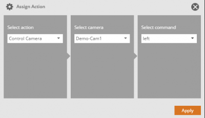 If the Control camera action is selected, you can assign a command for one of the stored cameras in the camera configuration menu.