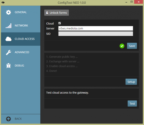 Check the mark to activate the cloud access and click “Save” (Important: Don't change the server settings) Finally click on “Setup”. Now the cloud access will be activated.