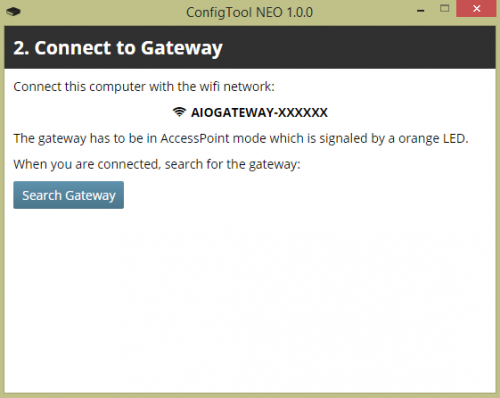 The RGB LED of the gateway should light in solid orange (access point mode). Now you can connect your computer to the gateway's own WLAN/ Wifi (not your home WLAN). For this purpose go to the WLAN/ Wifi settings of your computer and select the network named „AIOGATEWAY–XXXXXX“ (instead of XXXXXX you will see the last digits of the mac address of your gateway). Once your computer has been connected to this WLAN/ WiFi, click on “Search Gateway”.