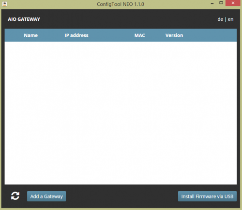 To initially configure a new AIO GATEWAY V5 with the ConfigTool NEO click on the button “Add a Gateway” on the start screen.