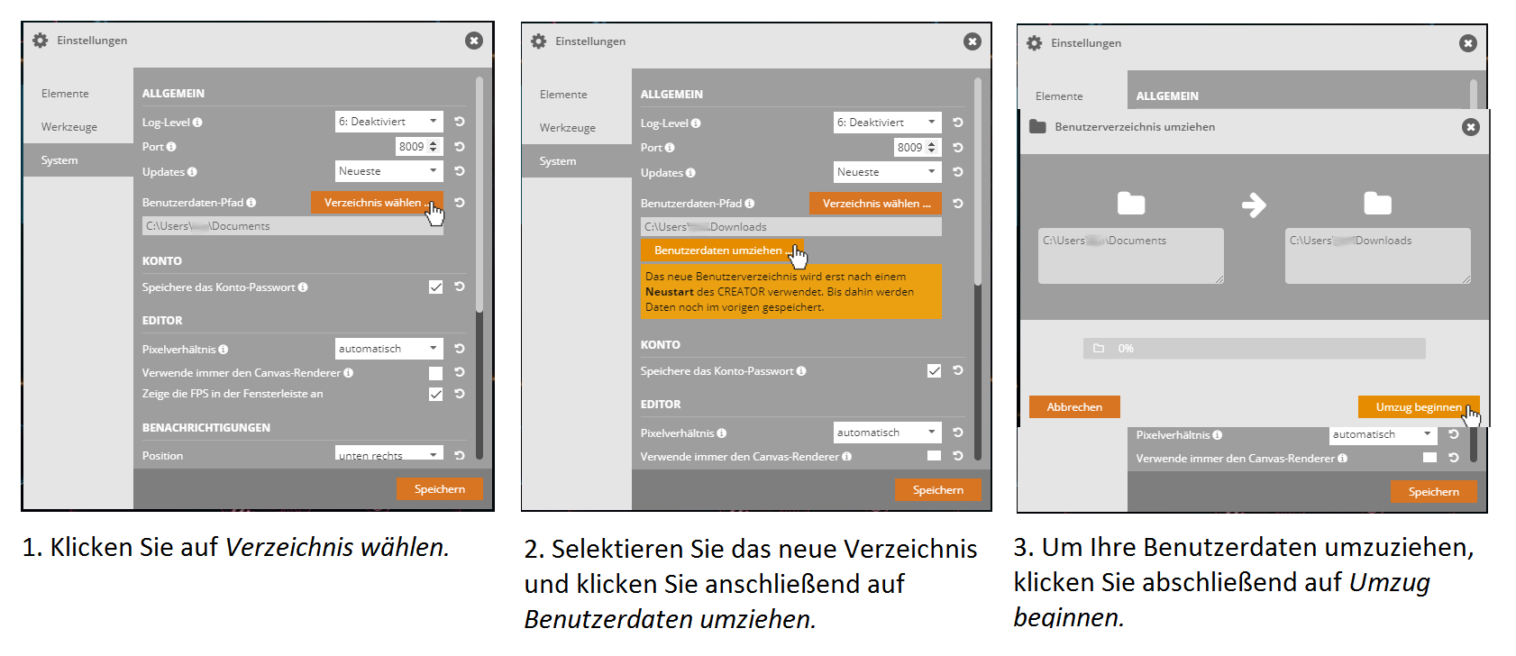 Hinweis: Das neue Verzeichnis wird erst nach einem Neustart des CREATOR verwendet.