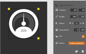 Sie können auch alle Rundslider als Analogmeter verwenden, indem Sie die Bedienung für den Rundslider deaktivieren und dem Rundslider den entsprechenden Gerätestatus zuweisen. Die Bedienung deaktivieren Sie in der rechten Eigenschaftsleiste unter „Erweiterte Optionen“.
