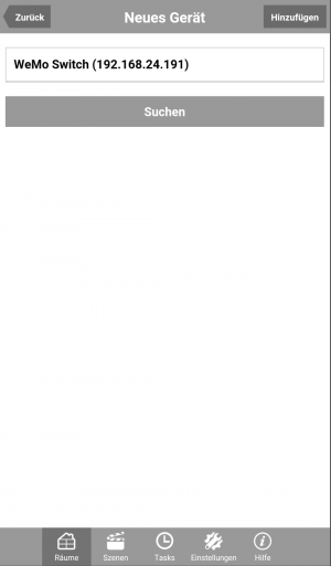 Wählt man Belkin Wemo und tippt auf „weiter“, werden alle vorkonfigurierten und mit dem Netzwerk verbundenen Belkin Wemo IP-Komponenten angezeigt.