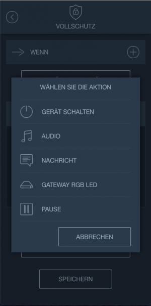 Tippen Sie auf „Aktion hinzufügen“, um eine Aktion hinzuzufügen, die im Falle eines Alarms ausgelöst werden soll. Hier gibt es verschiedene Möglichkeiten.