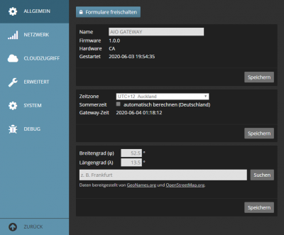 In diesem Bereich können der Name des Gateways, der Standort und eine Zeitzone eingestellt werden. An dieser Stelle können Sie Ihr V6 Plus ebenfalls auf die neuste Firmware-Version aktualisieren (empfohlen), sobald eine neue Version verfügbar ist.