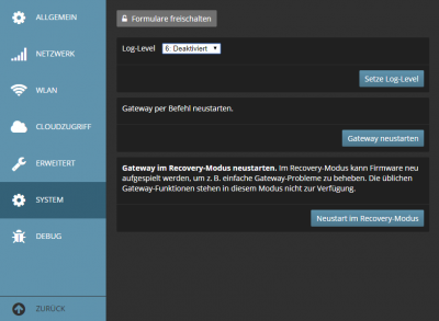 Unter dem Menüpunkt System kann das Gateway neu gestartet werden und das Level für die Aufzeichnung von Logdateien gesetzt werden. Zusätzlich kann das Gateway hier in den Recovery-Modus versetzt werden.