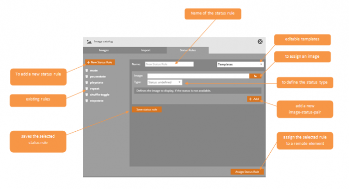 By using status rules you can define, which image will be displayed for which status. You can assign a status rule to a remote element placed on a remote page (button or image), so that this element will show different images according to the defined rules.