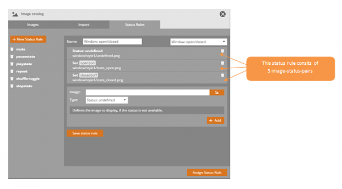 The tab “status rules” is part of the image catalog of AIO CREATOR NEO. By using status rules you can define which image will be displayed on which status.