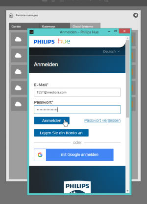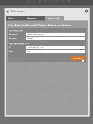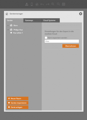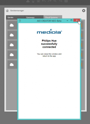 In the AIO CREATOR NEO Device Manager there are three different Tabs. Gateways, Device and Cloud Systems. In the Tab Cloud Systems, you can connect various cloud-based systems and devices to AIO CREATOR NEO. In order to connect Cloud Devices and Cloud Systems you have to set up the cloud access in the corresponding original system first, so that you have access data available. To use Cloud Systems valid mediola cloud services a required too.