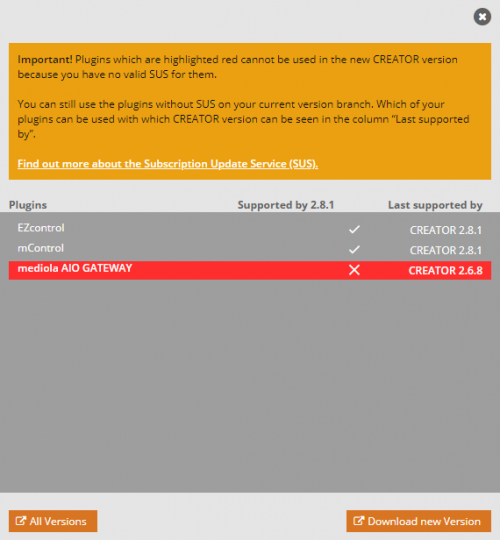 If the available upgrade is a minor or major upgrade (1st or 2nd version number changes), which means that the upgrade is SUS-relevant, a new window opens, where you can check whether your plugins are still supported after the upgrade or whether you need a SUS extension to be able to use your plugins with the new version. If your plugins are still supported click on download new version . If your plugins are no longer supported, you can close the window and purchase an SUS extension, or you can instead just make a patch update (only the 3rd version number changes)in the branch your plugins are still supported. (In the screenshot e.g. from 2.6.8 to 2.6.9 instead of upgrading to 2.8.1) To load the corresponding patch update , click on All versions and install the appropriate patch version from our website.