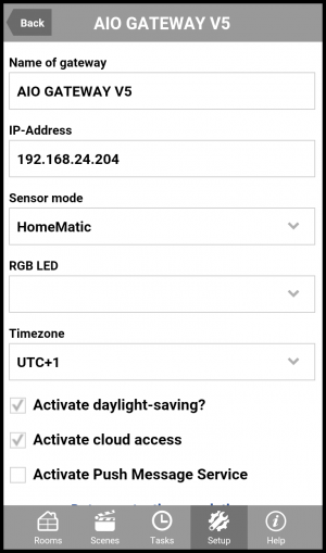 To activate the cloud access you have to open the category “Settings” and than the tab “Settings”. Now select the gateway for which you want to activate the cloud access.