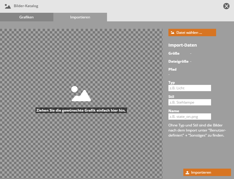 Beim Import können rechts die Parameter „Typ“, „Stil“ und „Name“ für das Bild eingegeben werden.