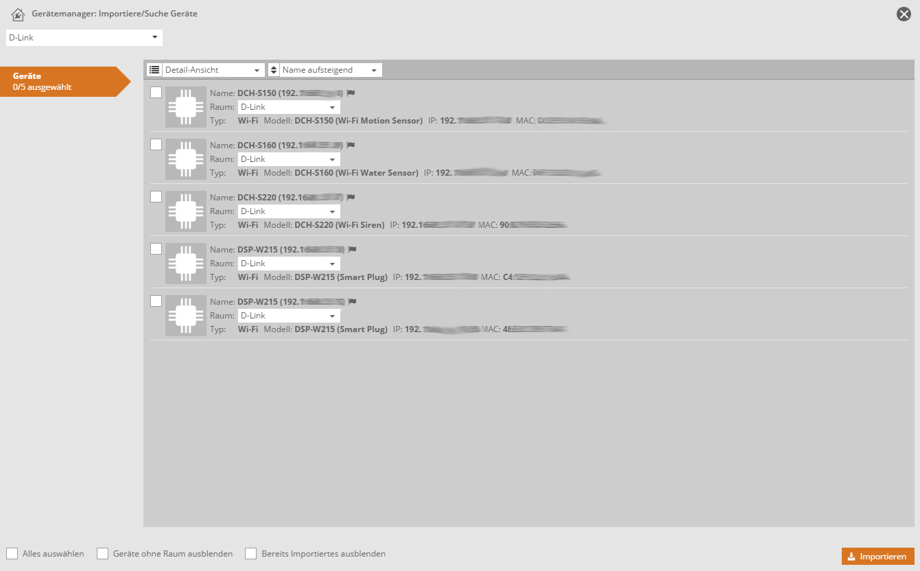 Anschließend werden alle Geräte dieses Typs aufgelistet, die sich im gleichen Netzwerk befinden wie der PC. Die zu importierenden Geräte können nun per Haken selektiert und importiert werden.