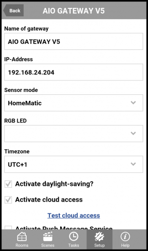 To activate the cloud access you have to open the category “Settings” and than the tab “Settings”. Now select the gateway for which you want to activate the cloud access.