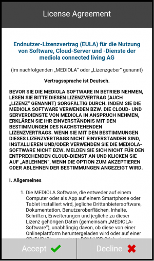 Once you have downloaded and started IQONTROL the License Agreement of the mediola - connected living AG will appear.