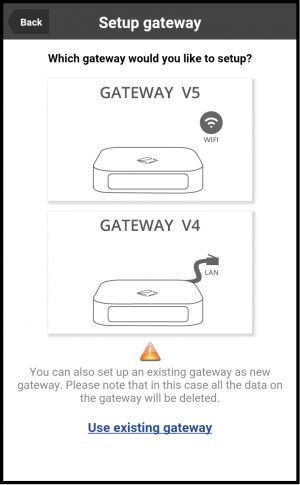 Please connect the AIO GATEWAY to a power source now. After booting the RGB LED of the gateway should light in solid orange (access point mode). In this case tap on „next“.