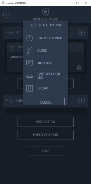 Event actions are actions that should be executed when the alarm has been activated or deactivated. You can select event actions similar to standard actions. This way it is possible to shut down the roller shutters or send a push message “alarm has been activated” to certain mobile devices when the alarm has been activated (or deactivated).