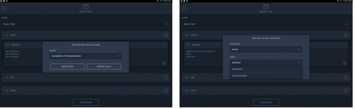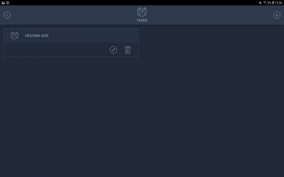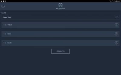 In the Tasks area, you can create cross-device automations. In a task you can define trigger events, i.e. a device status or a time, to automatically execute a specified sequence of device actions.