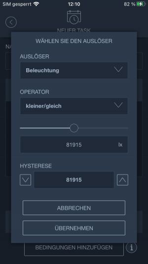 A hysteresis is therefore always offered in the Tasks area for all devices that are triggered in response to values. This is automatically set to the lowest possible hysteresis value as soon as you enter a value as a trigger. You can adjust the hysteresis as you like.